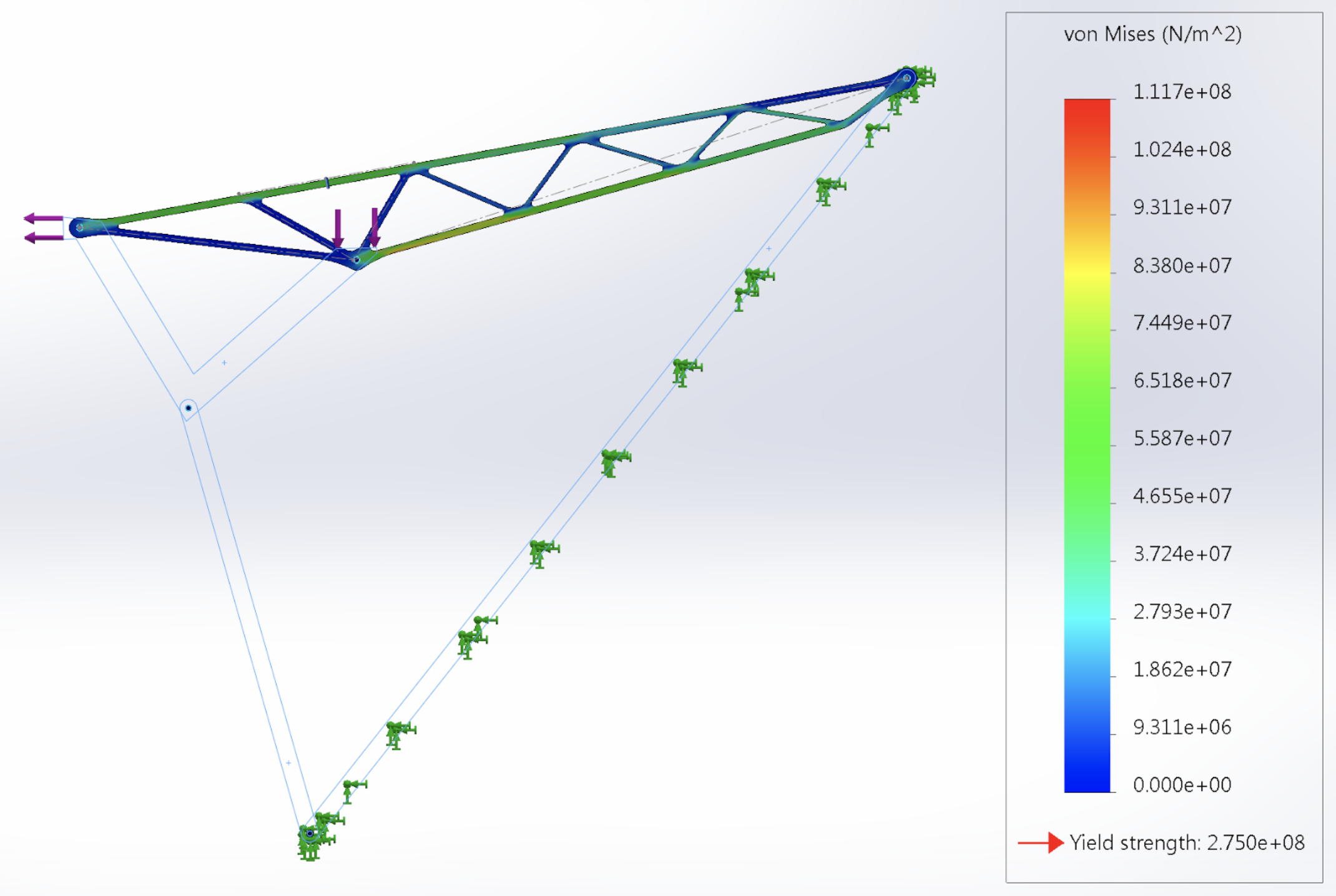 I investigated stress normal to the cross section of the members to see that the entire structure was bending rather than just individual members, indicating a more stiff and weight-efficient structure. This is seen from the blue compressive stress along the top edge and yellow tensile stress along the bottom edge. I used this result at the members most likely to experience buckling, the longest members in compression, and calculated the thickness required to achieve a minimum safety factor of 2.5 for the buckling failure mode.